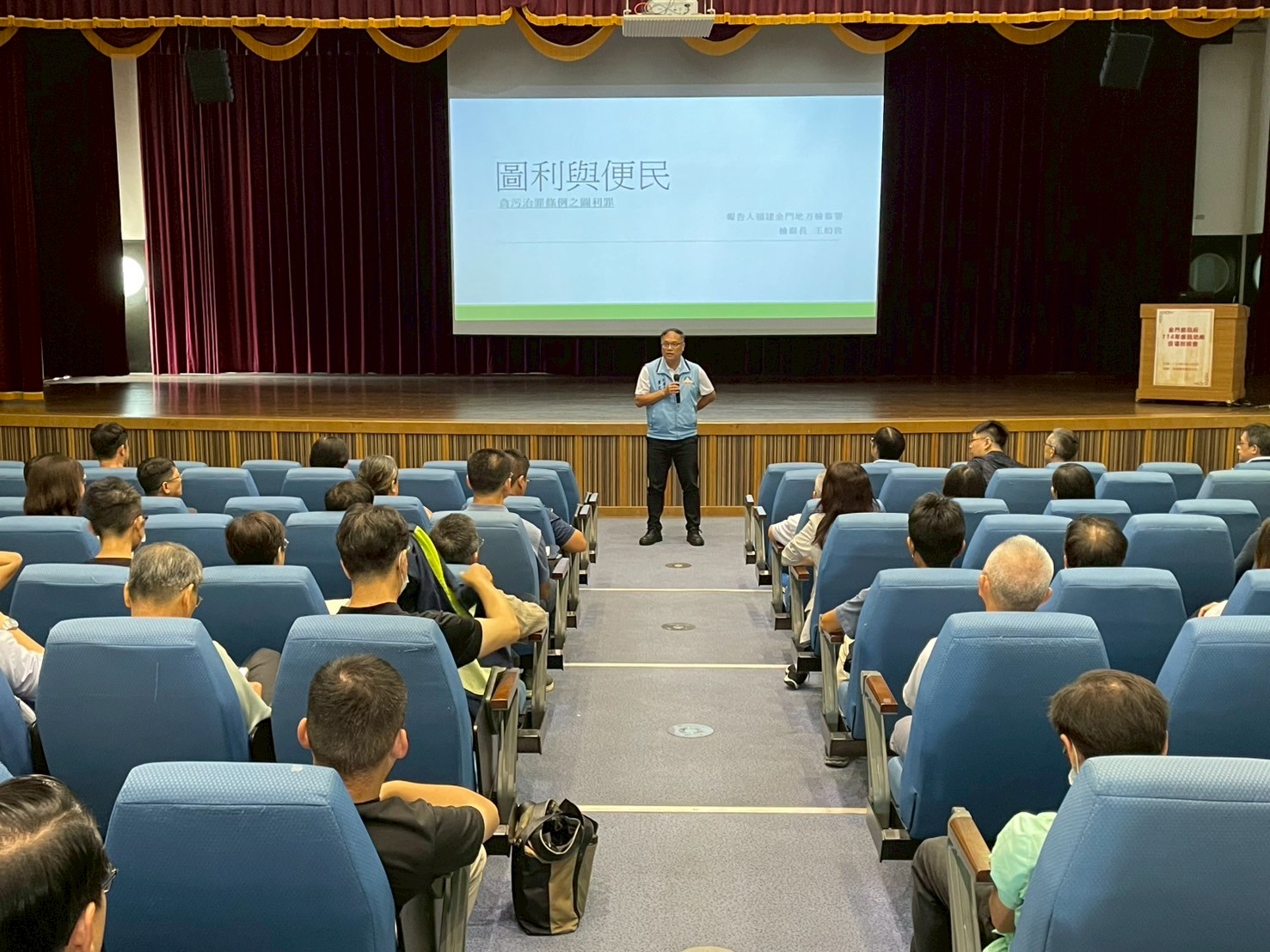金門縣政府於114年9月4日假城中藝文中心舉辦「114年度廉政法規宣導說明會」,邀集本府及所屬機關首長、補助業務主管、財產申報義務人、兼辦政風業務人員參加,並開放採購廉政平臺工程廠商及民間團體與會,共計402人次。會中由福建金門地方檢察署王柏敦檢察長主講「圖利與便民—實務案例解析」,法務部廉政署潘佳伶專員講授「廉政法規及財產申報案例概述」,監察院劉芷君調查員就「公職人員利益衝突迴避法」之補助、交易限制及身分關係揭露與公開等重點進行說明,並提出本府後續精進建議。